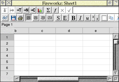 It’s worth noting here that in the screenshot above, the Fireworkz window is actually composed of multiple panes. There’s a pane with a fixed work area containing the button and status bars (the latter containing the text “Page 1”), which – just like the one that we have already created – does not scroll with the work area. Below it is a separate pane containing just the column headings for the sheet (from “b” through to “e” here), which does scroll: ensuring that the headings remain lined up with the associated cells in the main window.