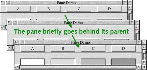 Since the event was for the main window, PROCopen_window_request goes on to call PROChandle_pane_windows, which positions the toolbar pane’s visible area correctly and then opens it behind the same window that the main window is behind: in this case, at the top of the window stack. This results in the toolbar pane being inserted back at the top of the stack as seen in Figure 5.3, pushing the main window down behind it again – back into its correct place.