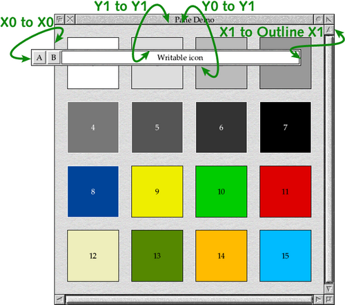 There is one small issue, however. The position of the pane is being set in visible area coordinates, but for X1 we’re now using the window outline in order to include the area covered by the vertical scroll bar. The outline coordinates, by definition, include the border around the edge of the window, whilst the visible area coordinates do not – although since the X1 coordinate is exclusive, both are offset by one pixel to the right as seen in Figure 8.4.