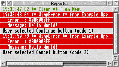 Being static, neither error_wimp_os_report() nor error_complete_block() are available to our application; instead, the library builds on them to define some more functions which are for its use. The first, error_report_error(), reports a message – pointed to by *message – with an error status and a Continue button: