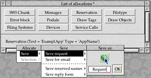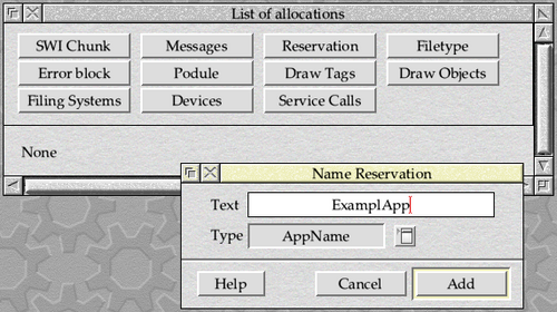 We need an application name reservation for “ExamplApp”, so we click on Reservation and select AppName in the Type field. Enter ExamplApp into the Text field, and click on Add. The List of allocations window should update to show the allocation, as seen in Figure 17.7. All that we now need to do is save the allocation out as a file which can be attached to an email and sent to the allocation address. See !Allocate.!Help for full details of the process.