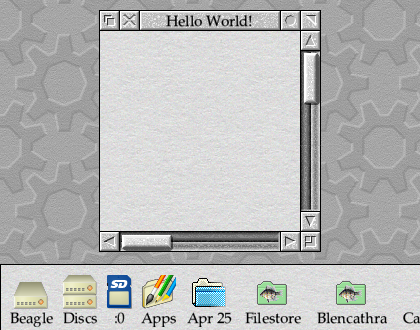 With a bit of tidying up to include the necessary function prototype and #include "sflib/event.h" in c.win, this addition can be found in Download 11.2. When run, clicking Select on the iconbar icon will open our window – which should now move around when dragged, and respond to resizing and scrolling.