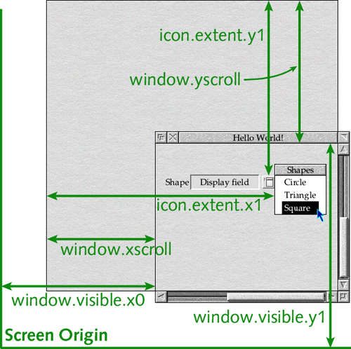 For the horizontal coordinate, the position of the right-hand edge of the icon relative to the screen origin can be calculated by adding the position of the left-hand edge of the window’s visible area relative to the screen origin to the position of the right-hand edge of the icon relative to the window’s work area. If the window has been scrolled horizontally then this will move the icon towards the screen origin, but we can take account of this by subtracting the horizontal scroll offset. This can be seen graphically in Figure 24.4.
