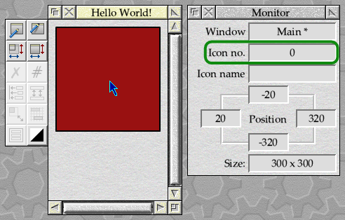 In many template editors, this should automatically renumber the sprite icon containing the square to be icon 0 because there are no other icons left in the window. If it does not, then use the renumbering facility to change the value; in WinEd, click Menu over the icon, slide over Icon → Renumber → to the Renumber icon dialogue box, enter 0 into the field and click on Renumber. The icon number can be found by hovering the mouse over the icon and looking at the Monitor, as seen in Figure 24.2.