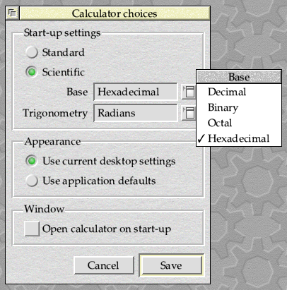 In addition to conventional menus accessed by the Menu button on the mouse, RISC OS allows for the use of pop-up menus in dialogue boxes. Whilst technically the same, they behave in a specific way and are usually used to replace groups of radio icons in dialogue boxes. An example from SciCalc’s Calculator choices can be seen in Figure 24.1.