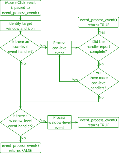 Unlike window-level handlers, these icon-level siblings report back whether or not they consider that they have completely handled an event. If they think that they have, then the dispatcher stops and reports success back to the caller of event_process_event(). If not, any other icon-level handlers that are registered for the icon in question will be tried, before the event is passed on to a window-level handler if one is registered. Figure 20.1 shows the process graphically.