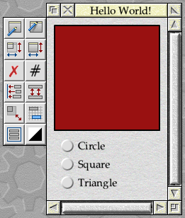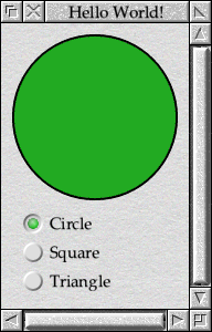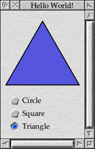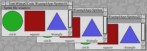 Compiling the code and running it should result in a window like the one in Figure 21.14, but attempting to use it will reveal a problem. Selecting the square is fine, but the other two shapes leave traces of their predecessor around the edges of the image. This is due to the masked background of the images: the Wimp cuts as many corners as it can when redrawing icons, and assumes that sprites will not contain masked areas.