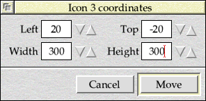 We will position the icon so that it is 20 OS units from the top-left of the window. Enter 20 in the Left field and −20 in the Top field (remember that the work area coordinates usually count down from zero at the top of the window). The Width and Height should both be 300 OS units as a result of resizing the icon to fit the sprite – if not, check the sprite design! With the numbers set, click on Move to adjust the icon.