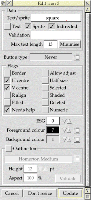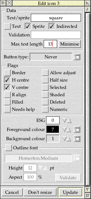 To deal with the possible buffer truncation problem first, change the contents of the Text/sprite field. We could enter “triangle” as the longest sprite name, or we could enter “square ” with six spaces after the name to reserve the full 12 characters. The latter option gives us the best of both worlds, since the spaces at the end of the sprite name are ignored by OS_SpriteOp. We will be overwriting the name with a properly terminated one when our application initialises the icon, anyway.