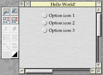 To move the three radio icons down below the sprite, we can pick the selected group up and drag them around. If they are picked up over the top icon of the three (number 0), then the Monitor will show the position of that icon. Since the sprite icon is 300 OS units high, with a margin of 20 OS units above it, leaving a similar margin below will result in the top edge of the top radio icon needing to be −340 OS units from the top of the window. With the icons at the size they are in the supplied template file, they will be roughly centred in our design if the left-hand edge is at 36 OS units. This can be seen in Figure 21.9.